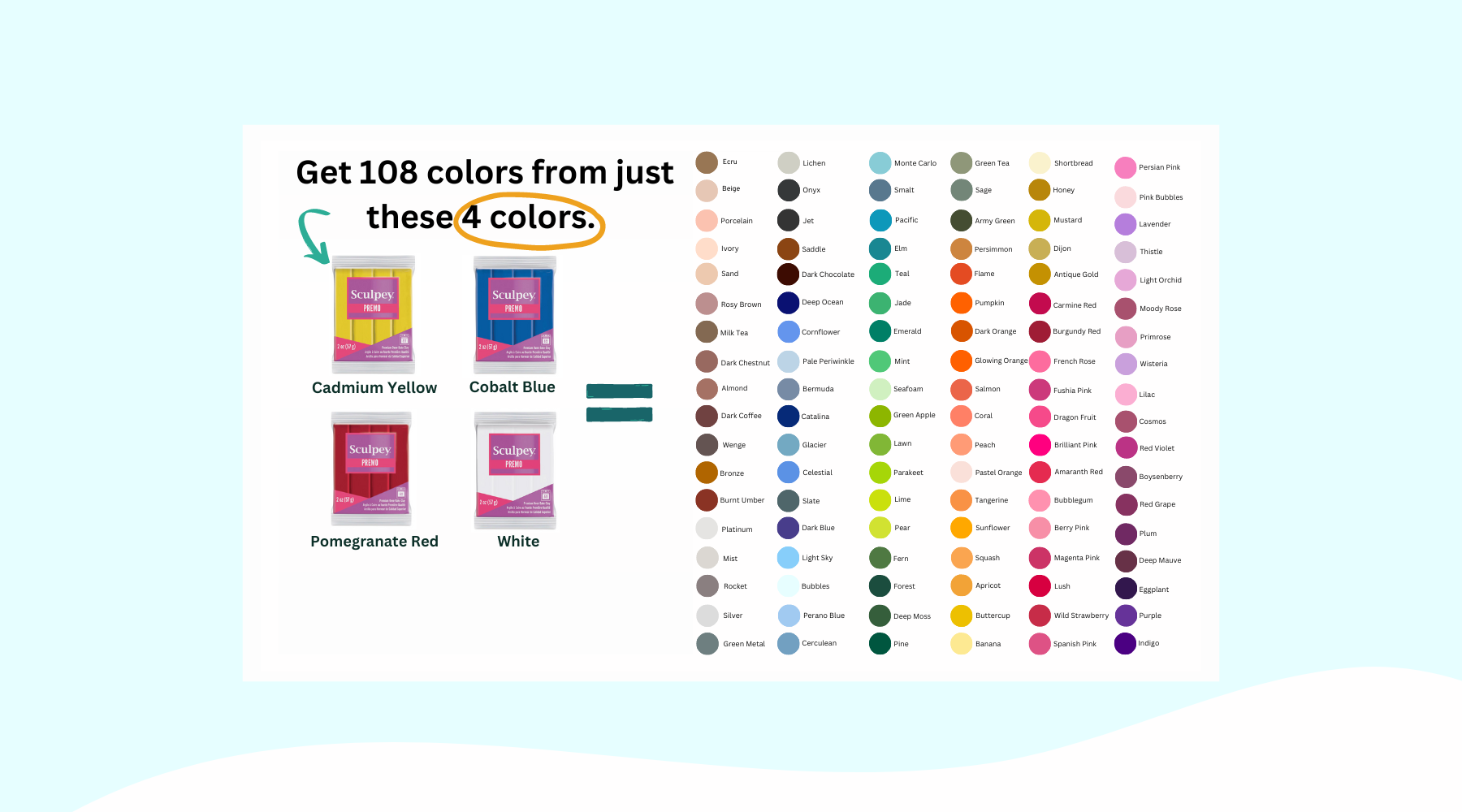 Buy, download and print out the 108 Master Clay Color Card Collection.